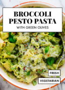 Make this broccoli pesto pasta recipe for a fresh and veggie-packed dinner! Featuring broccoli, toasted pine nuts, green olives and Parmesan.