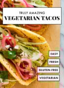 Truly amazing vegetarian tacos featuring easy-to-make refried beans, quick-pickled onions, and creamy avocado sauce! Even meat lovers go crazy for these tacos.